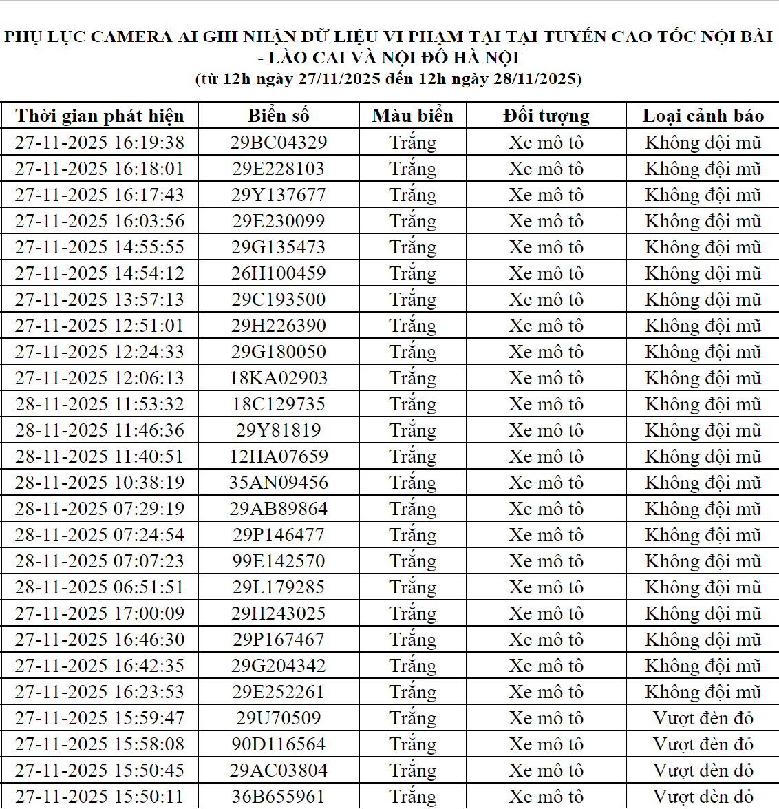 Ngoài ra, qua trích xuất dữ liệu từ camera A.I được thí điểm lắp đặt tại nội đô Hà Nội (nút giao phố Phạm Văn Bạch – Hoàng Quán Chi) từ 12h00’ ngày 27/11/2025 – 12h00’ ngày 28/11/2025, đã tự động phát hiện: 22 trường hợp người điều khiển mô tô, xe gắn máy không đội mũ bảo hiểm; 29 trường hợp không chấp hành hiệu lệnh của đèn tín hiệu – vượt đèn đỏ. Danh sách cụ thể như sau: