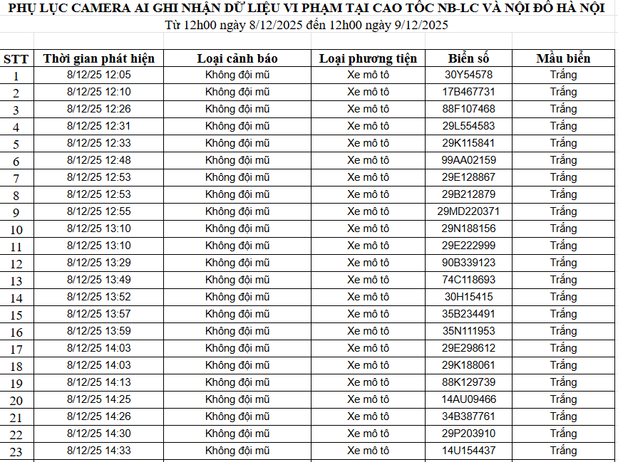 Theo Cục Cảnh sát giao thông, Từ 12h00’ ngày 7/12/2025 đến 12h00’ ngày 8/12/2025, qua trích xuất dữ liệu từ camera A.I được thí điểm lắp đặt tại nội đô Hà Nội (nút giao phố Phạm Văn Bạch – Hoàng Quán Chi), đã tự động phát hiện 148 trường hợp xe mô tô (xe máy) vi phạm.