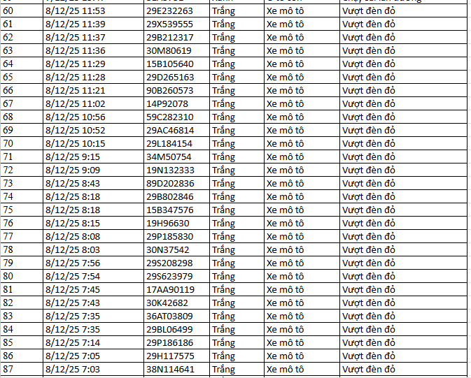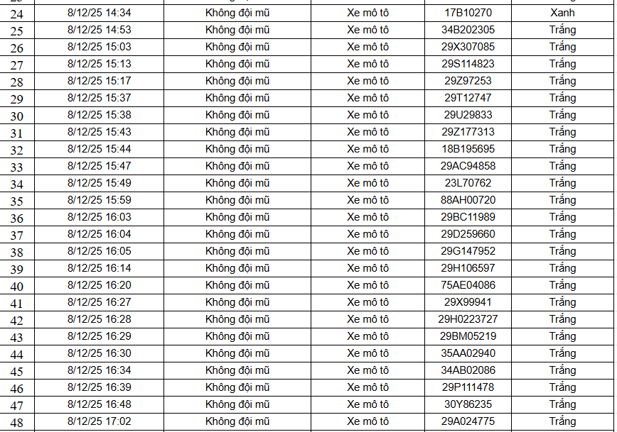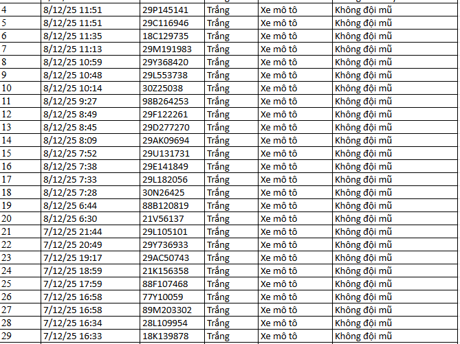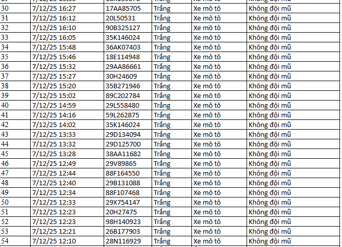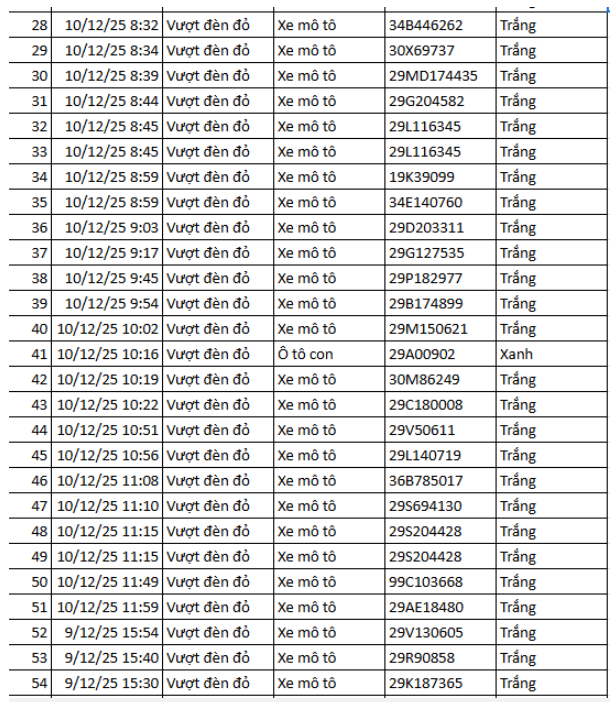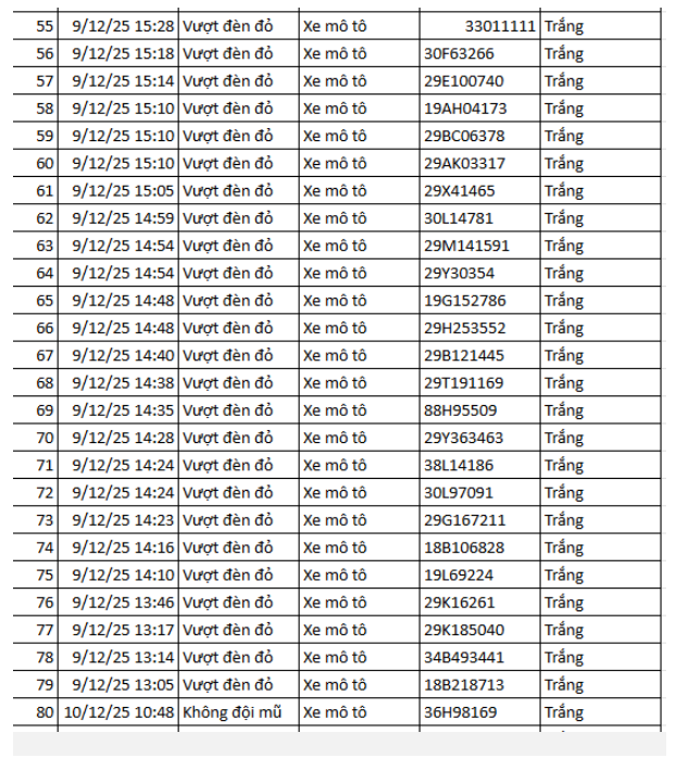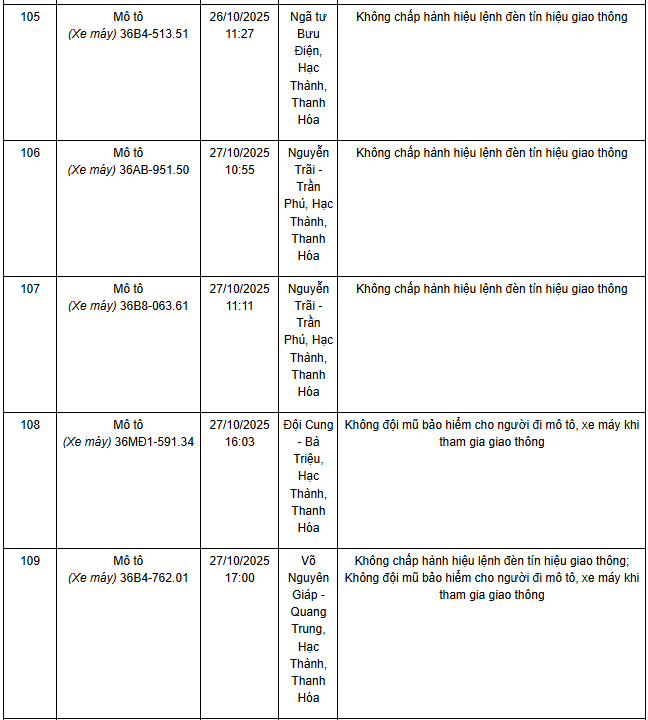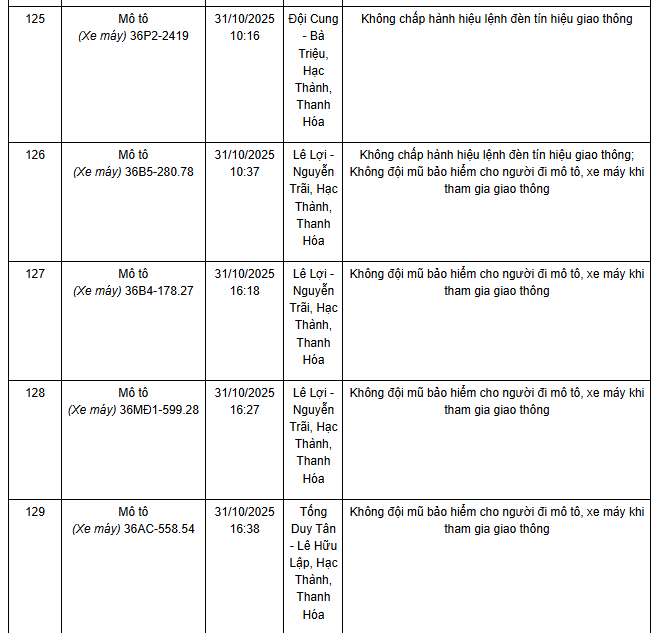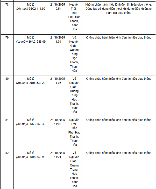 Ngày 1/12, Phòng CSGT Công an tỉnh Thanh Hóa thông báo các phương tiện vi phạm về TTATGT đường bộ được phát hiện qua Hệ thống camera giám sát an ninh, trật tự và an toàn giao thông trên địa bàn từ ngày 20/10/2025 đến ngày 31/10/2025. Theo danh sách, có 52 trường hợp xe máy vi phạm.
