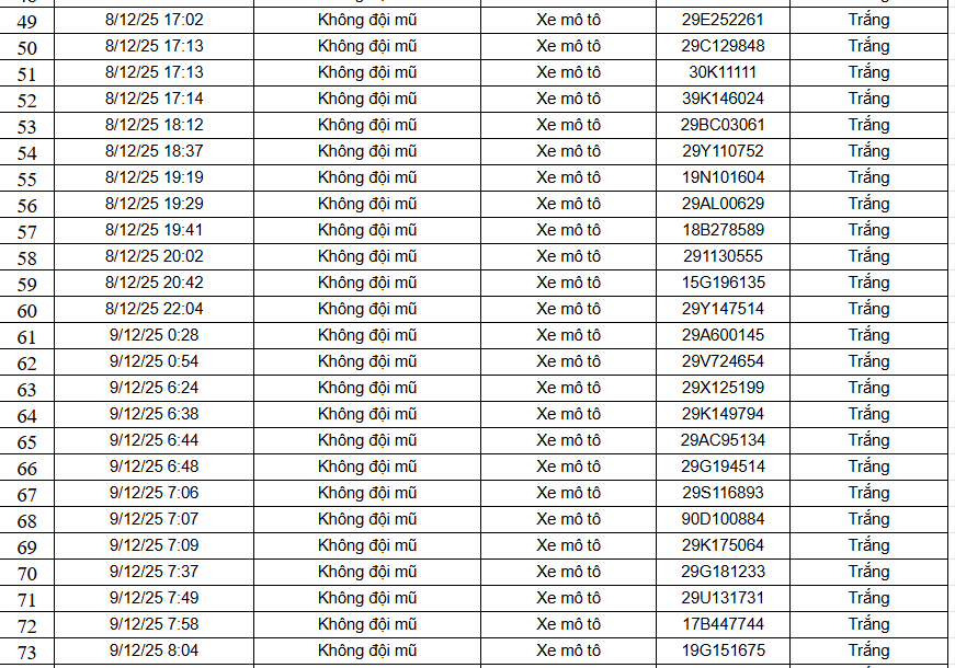 Danh sách 52 trường hợp xe máy vi phạm như sau:
