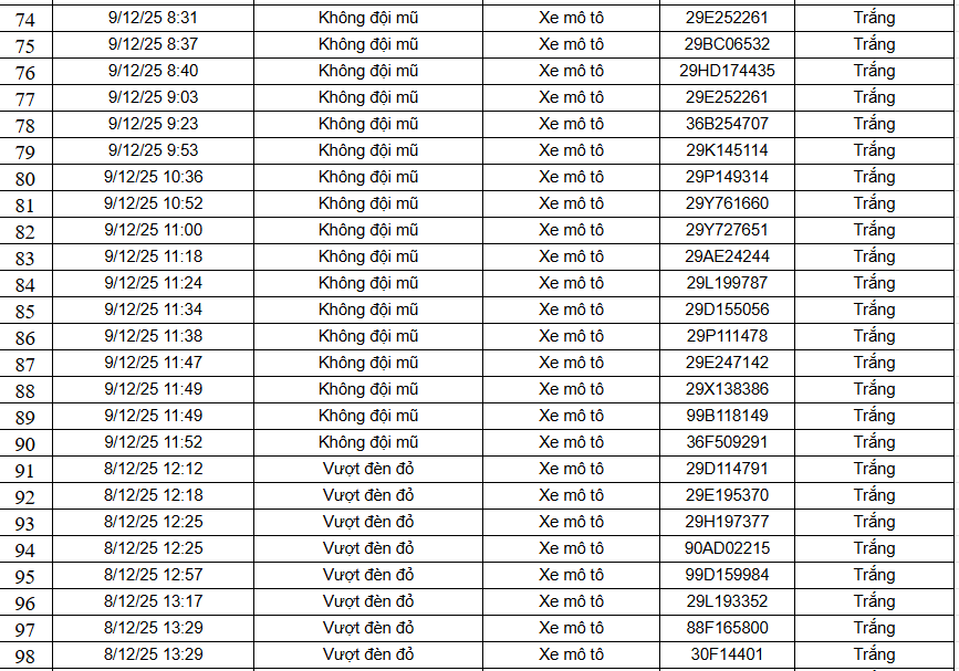 Danh sách 148 trường hợp xe máy vi phạm như sau: