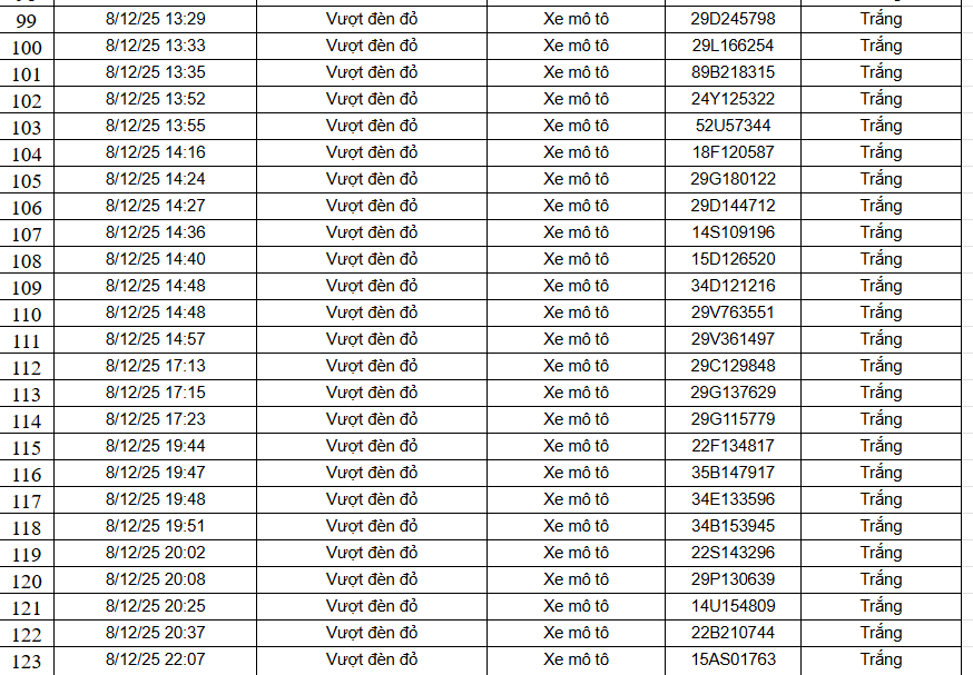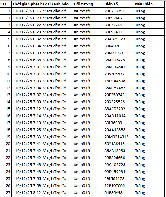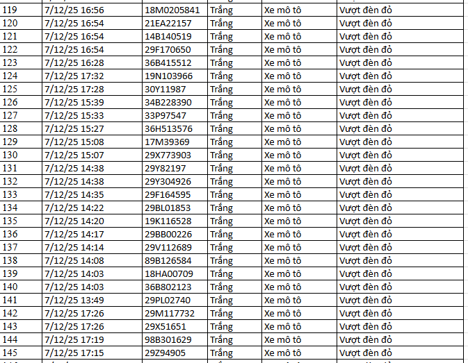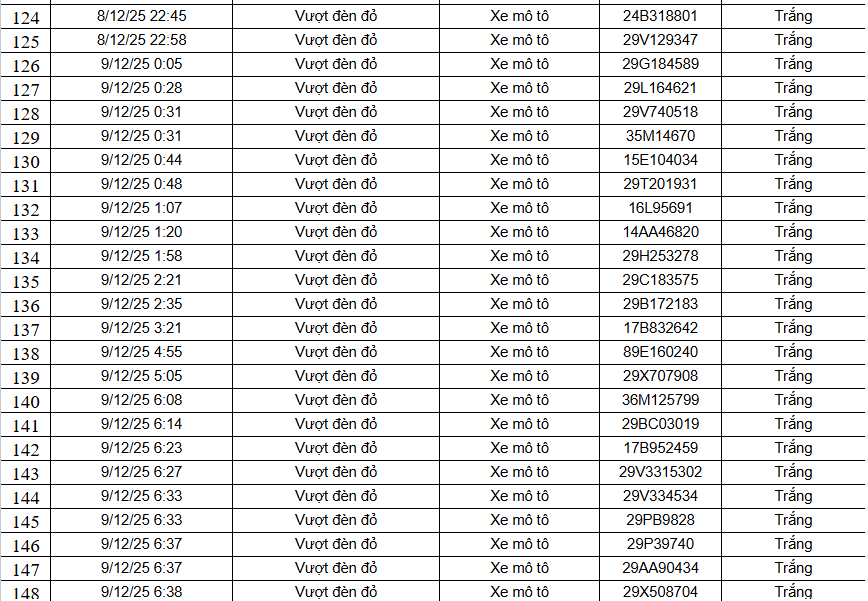 Theo Cục Cảnh sát giao thông, từ 12h00’ ngày 9/12/2025 đến 12h00’ ngày 10/12/2025, qua trích xuất dữ liệu từ camera A.I được thí điểm lắp đặt tại nội đô Hà Nội (nút giao phố Phạm Văn Bạch – Hoàng Quán Chi), đã tự động phát hiện 129 trường hợp xe mô tô (xe máy) vi phạm.
