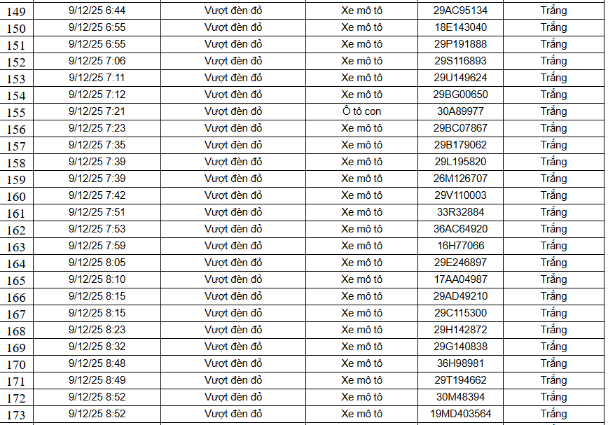 Danh sách 176 trường hợp xe máy vi phạm như sau: