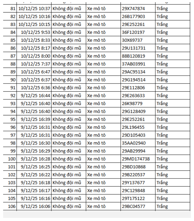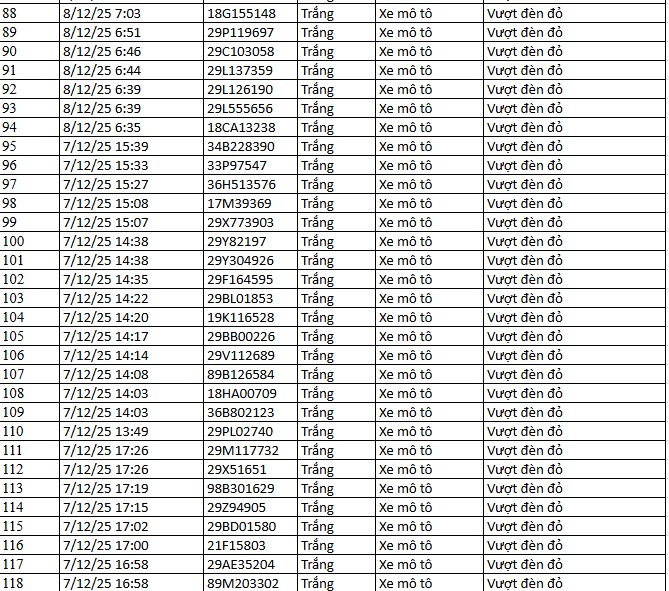Ngày 9/12, Phòng CSGT Công an tỉnh Bắc Ninh thông báo danh sách các phương tiện vi phạm bị phạt nguội từ ngày 30/11 đến 07/12/2025.