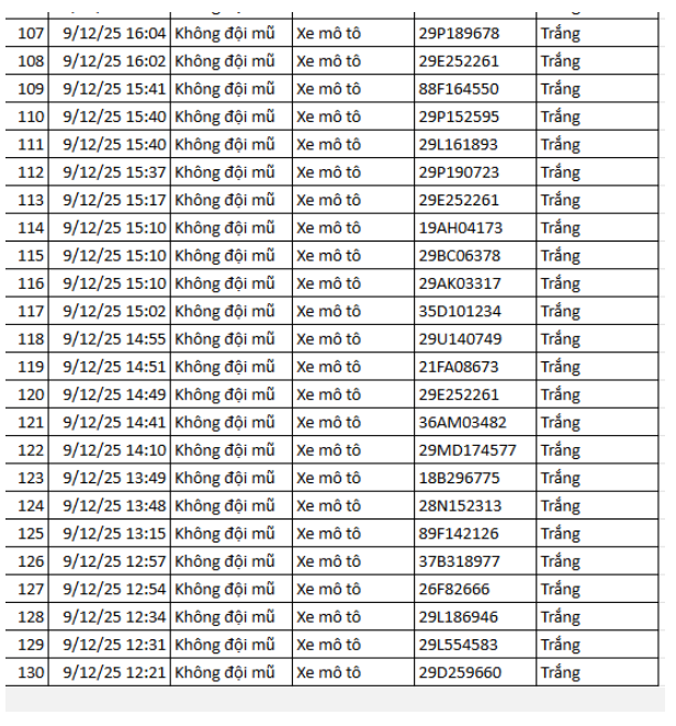 Danh sách 129 trường hợp xe máy vi phạm như sau: