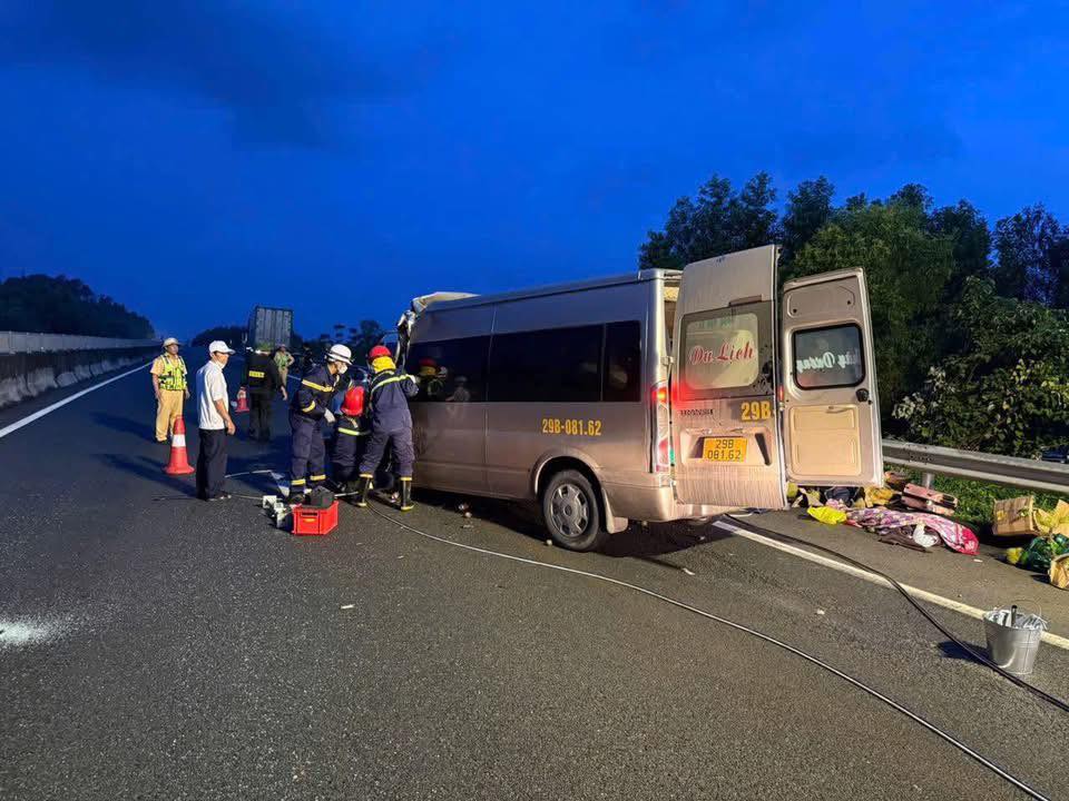 Cú va chạm khiến 3 người trên xe khách tử vong tại chỗ. Đầu xe 16 chỗ bị biến dạng hoàn toàn. Lực lượng cứu hộ và CSGT nhanh chóng có mặt để đưa thi thể các nạn nhân ra ngoài, hỗ trợ đưa người bị thương đi cấp cứu và điều tiết giao thông trên tuyến cao tốc.