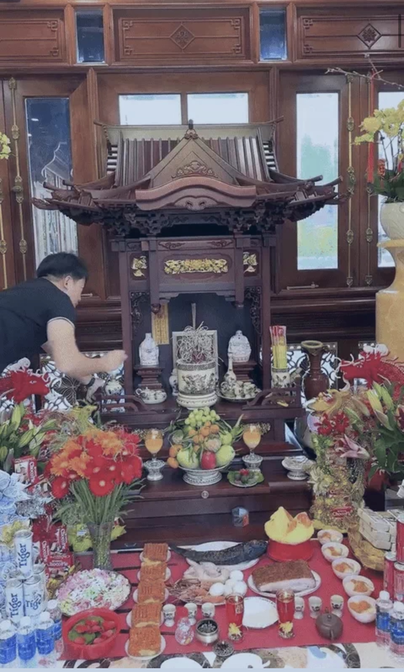 CEO Mailisa cũng chuẩn bị rất nhiều đồ lễ để dâng lên bàn thờ Thần Tài – Thổ Địa của gia đình. Bàn thờ được làm bằng gỗ, có kích thước cao và rộng vượt trội so với các mẫu thông thường, tạo cảm giác uy nghi và sang trọng. Xung quanh được trang trí cẩn thận với nhiều loại hoa đặc trưng như hoa lan, hoa đào, hoa loa kèn, hoa đồng tiền… Lễ vật dâng gồm đầy đủ các món mặn như cá lóc, thịt lợn quay, tôm, trứng, cùng các món ngọt và đồ chay như bánh mứt, kẹo lạc, bánh trôi, xôi gấc. Toàn bộ đều do chính tay vợ chồng Mailisa tự bày biện và sắp xếp, thể hiện sự chỉn chu và lòng thành kính trong từng chi tiết.