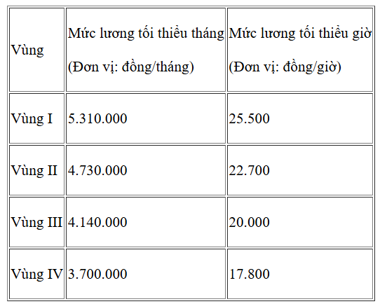 Cụ thể, lương tối thiểu vùng I tăng từ 4,96 triệu đồng/tháng lên 5,31 triệu đồng/tháng; Vùng II tăng từ 4,41 triệu đồng/tháng lên 4,73 triệu đồng/tháng; Vùng III tăng từ 3,86 triệu đồng/tháng lên 4,14 triệu đồng/tháng; Vùng IV tăng từ 3,45 triệu đồng/tháng lên 3,7 triệu đồng/tháng.