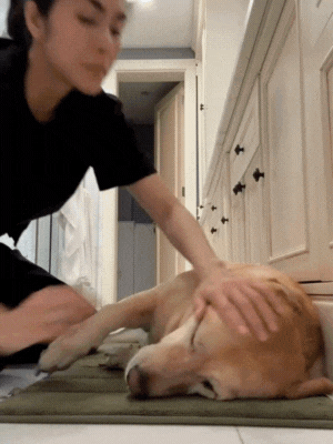 Louis Nguyễn nhẹ nhàng vuốt ve Molly khi chú cún mệt mõi, nằm ra sàn (Ảnh: Instagram nhân vật)