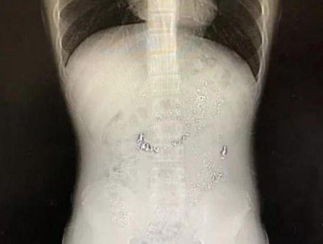 Hình ảnh chụp X-quang cho thấy bé trai đã nuốt một lượng nhỏ thủy ngân vào trong bụng. Tuy nhiên phía bác sĩ cho biết niêm mạc dạ dày không bị tổn thương nên lượng nhỏ thủy ngân này sẽ bị đào thải ra ngoài. Bố mẹ nên cho con ăn nhiều chất xơ thô như cần tây, tỏi tây. Bên cạnh đó, phía bác sĩ dành lời khen ngợi cho cách sơ cứu của người bố là hoàn toàn đúng đắn và rất chuyên nghiệp.