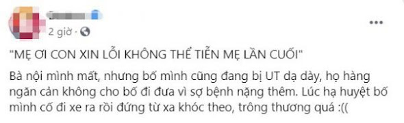Sự việc được biết đến khi một tài khoản đã chia sẻ lên mạng xã hội như sau: “Bà nội mình mất, nhưng bố mình cũng đang bị ung thư dạ dày, họ hàng ngăn cản không cho bố đi đưa vì sợ bệnh nặng thêm. Lúc hạ huyệt, bố mình cố đi xe ra rồi đứng từ xa khóc theo, trông thương quá”.