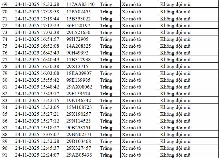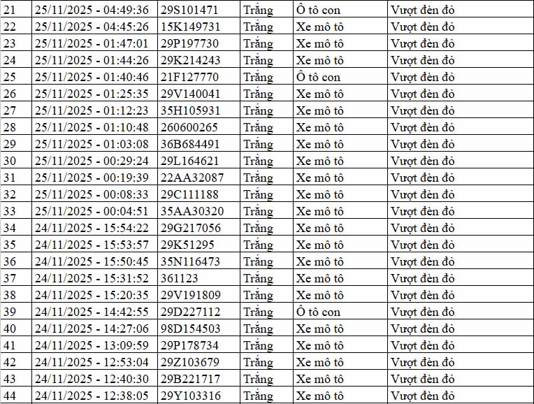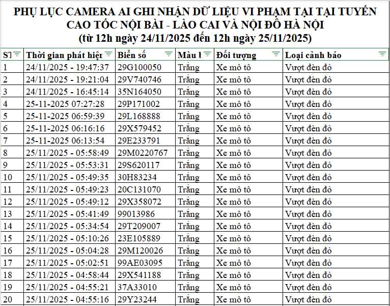 Thông tin từ Cục Cảnh sát giao thông (CSGT) – Bộ Công an, trong khoảng thời gian từ 12h ngày 24.11 đến 12h ngày 25.11.2025, hệ thống camera AI được thí điểm tại một số nút giao và tuyến đường ở Hà Nội đã ghi nhận nhiều vi phạm trật tự an toàn giao thông, trong đó nổi bật là hành vi vượt đèn đỏ và không đội mũ bảo hiểm.