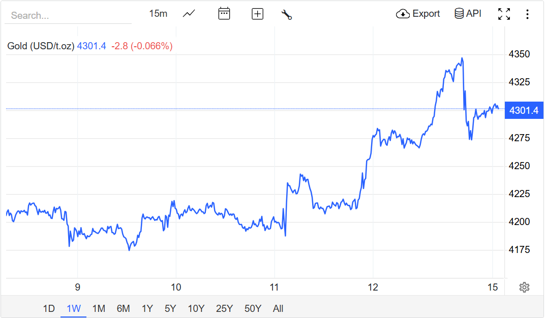 Giá vàng thế giới giao ngay trên thị trường châu Á lúc 7 giờ 15 sáng nay ngày 15/12 (giờ Việt Nam) giao dịch ở quanh ngưỡng 4.301 USD/ounce, tăng 5 USD/ounce so với chốt phiên tuần vừa qua.