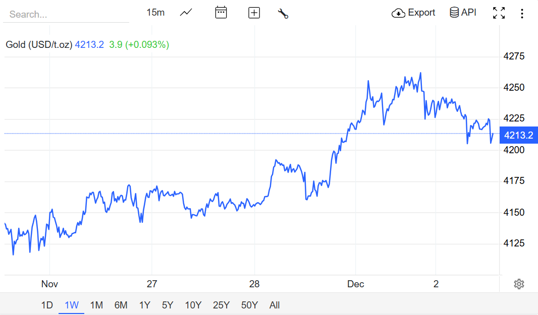 Theo Kitco News, khi thị trường toàn cầu bước sang tháng cuối năm, giá vàng đang giữ vững trên mức 4.200 USD/ounce. Bất chấp một số biến động hàng ngày, vàng vẫn vững vàng, duy trì đà tăng ổn định nhờ sự hội tụ của các yếu tố kinh tế vĩ mô. Những diễn biến địa chính trị gần đây, cùng với kỳ vọng ngày càng tăng về việc nới lỏng tiền tệ của Mỹ đã đẩy giá vàng lên mức cao nhất trong sáu tuần, tiếp tục đà tăng từ tháng 11.