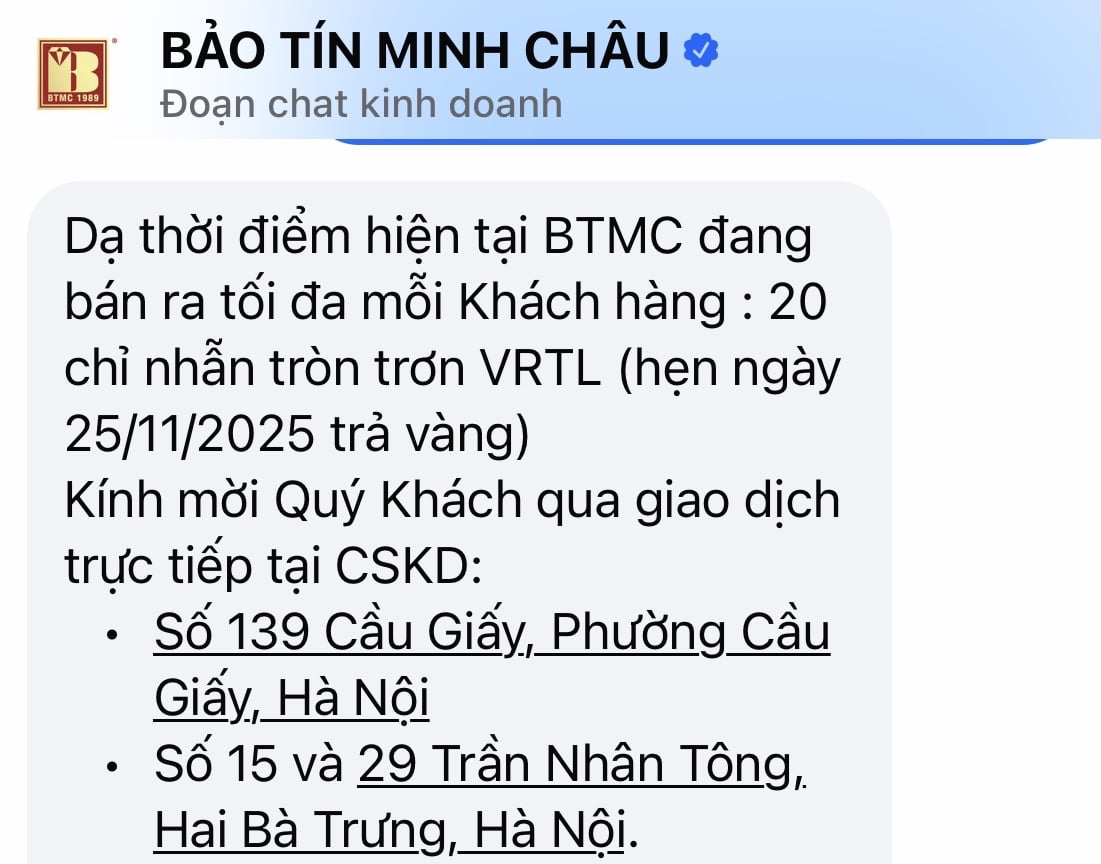 Nhân viên cửa hàng BTMC (29 Trần Nhân Tông, Hà Nội) cho biết, cửa hàng sáng nay bán tối đa 5 chỉ vàng nhẫn/người và khách hàng được nhận sản phẩm ngay khi thanh toán thành công. Sau buổi sáng, nhân viên tại cửa hàng lại cho biết, khách hàng được mua tối đa 20 chỉ vàng nhẫn/người, tuy nhiên 5 ngày sau (25/11) cửa hàng mới hẹn khách đến lấy vàng.