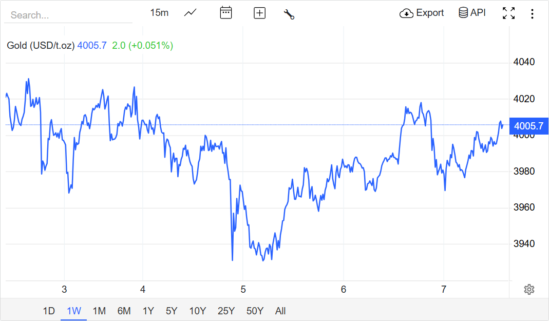 Giá vàng thế giới giao ngay trên thị trường châu Á lúc 14 giờ 30 phút ngày 7/11 (giờ Việt Nam) giao dịch ở quanh ngưỡng 4.005 USD/ounce, tăng khoảng 10 USD/ounce so với đầu giờ sáng này và tăng khoảng 20 USD/ounce so với cùng thời điểm hôm qua.