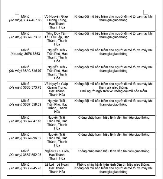 Công an Thanh Hoá thông báo kết quả phát hiện phương tiện vi phạm về trật tự an toàn giao thông qua hệ thống camera giám sát an ninh trật tự, an toàn giao thông từ ngày 11.10.2025 đến ngày 20.10.2025. Đáng chú ý trong số này có các biển số xe máy bị phạt nguội như sau: