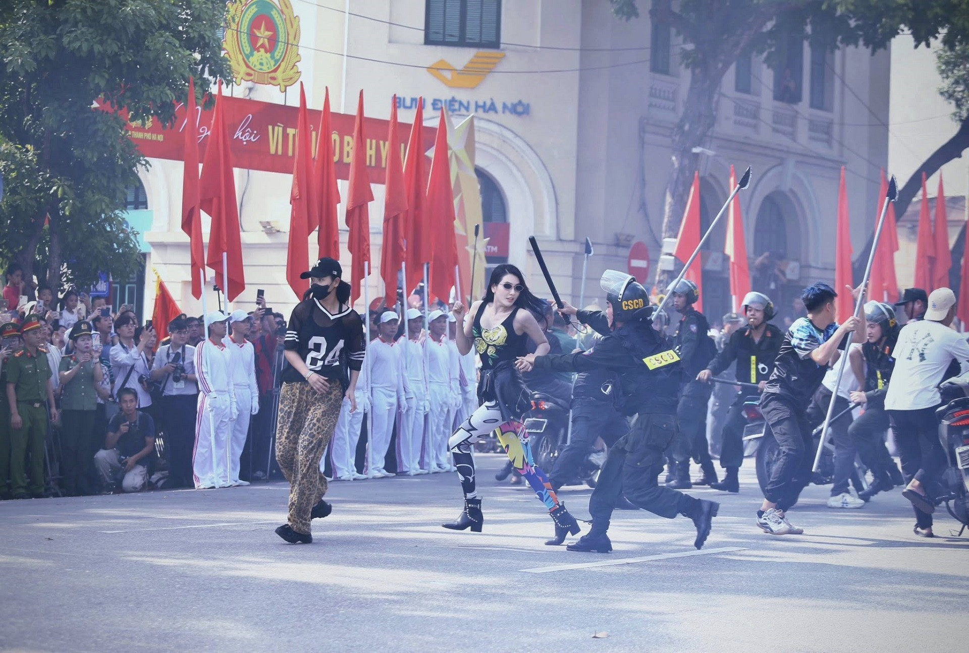 Trong đó, được chú ý nhất là màn biểu diễn tình huống giả định trấn áp các đối tượng đua xe gây mất an ninh trật tự. Nhân vật “girl phố” trong nhóm quái xế gây sốt với diễn xuất ấn tượng và ngoại hình nổi bật.